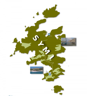 Symi liegt etwa 9 km westlich des türkischen Festlandes, 23 km nördlich der Insel Rhodos und fast 400 km südöstlich von Athen. Symi hat eine sehr stark zerklüftete Küstenlinie und eine Länge von 11,5 km bei einer maximalen Breite von 9 km. Sie ist gebirgig und bis zu 617 m hoch. Die meisten der etwa 2.500 Einwohner leben im gleichnamigen, schön um das alte Kastron gelegenen Hauptort im Norden der Insel vom Fischfang, der eher spärlichen Landwirtschaft auf der recht kargen Insel und dem immer wichtiger werdenden Tourismus. Die noch vor wenigen Jahrzehnten dominierende Schwammtaucherei spielt hingegen kaum noch eine Rolle. Eine Anbindung an das nationale und internationale Flugnetz gibt es nur über die nahe gelegenen Inseln Kos und Rhodos. Gleiches gilt für den Anschluss an das griechische Fährennetz. Symi wird seit einigen Jahren nur durch lokale Fähren und Ausflugsboote angefahren.